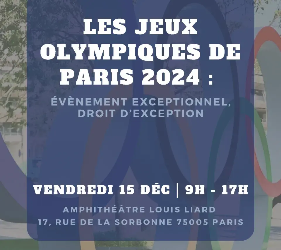 Colloque Image de couverture Le vendredi 15 décembre 2023 09h00 17h00 Colloque Jeux Olympiques Paris 2024 Ajouter à mon calendrier